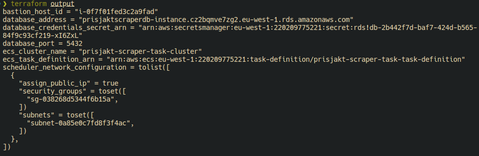 Disse outputene er nyttige om vi vil koble til databasen via proxyserveren. Shell scriptet db_connection.sh bruker ouptutet fra resurrsene som er opprettet: